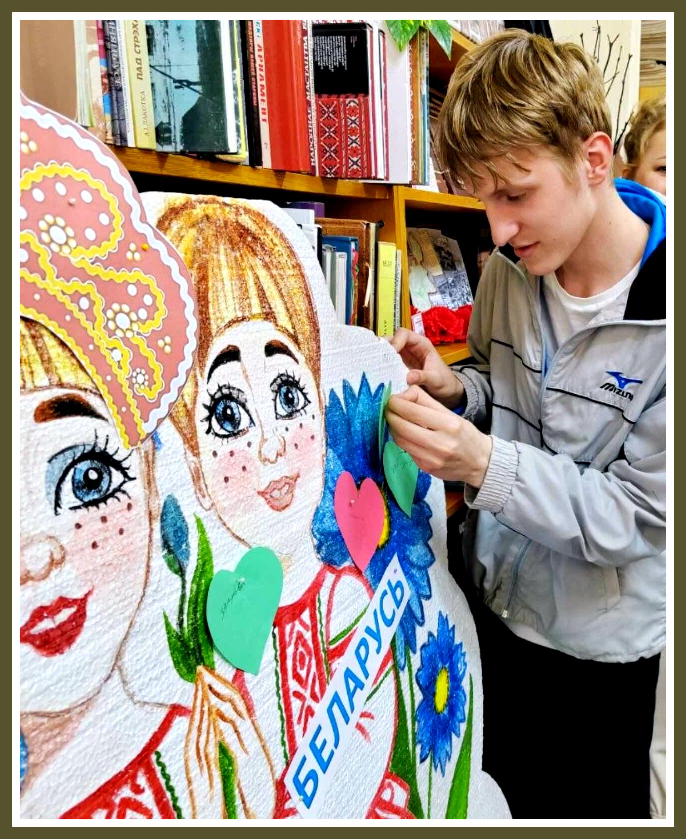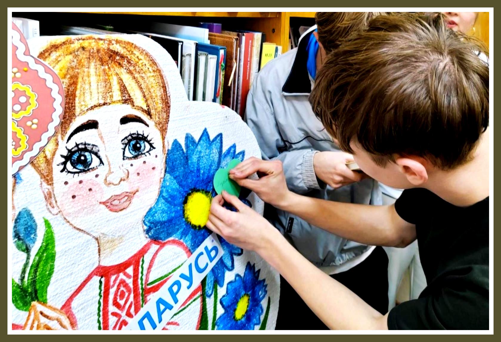 Напрыканцы нашай сустрэчы загадчык бібліятэкі Ларыса Касцюк і куратар групы Аксана Арабчык разам прачыталі кранальны верш пра брацкія народы Расіі і Беларусі. А ўдзельнікі нашага мерапрыемства напісалі свае шчырыя пажаданні на папяровых сардэчках і прычапілі іх на імправізаваны помнік дружбы нашых народаў.