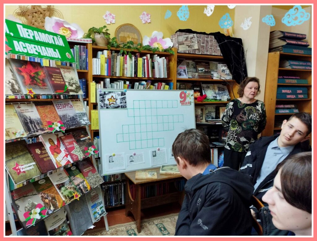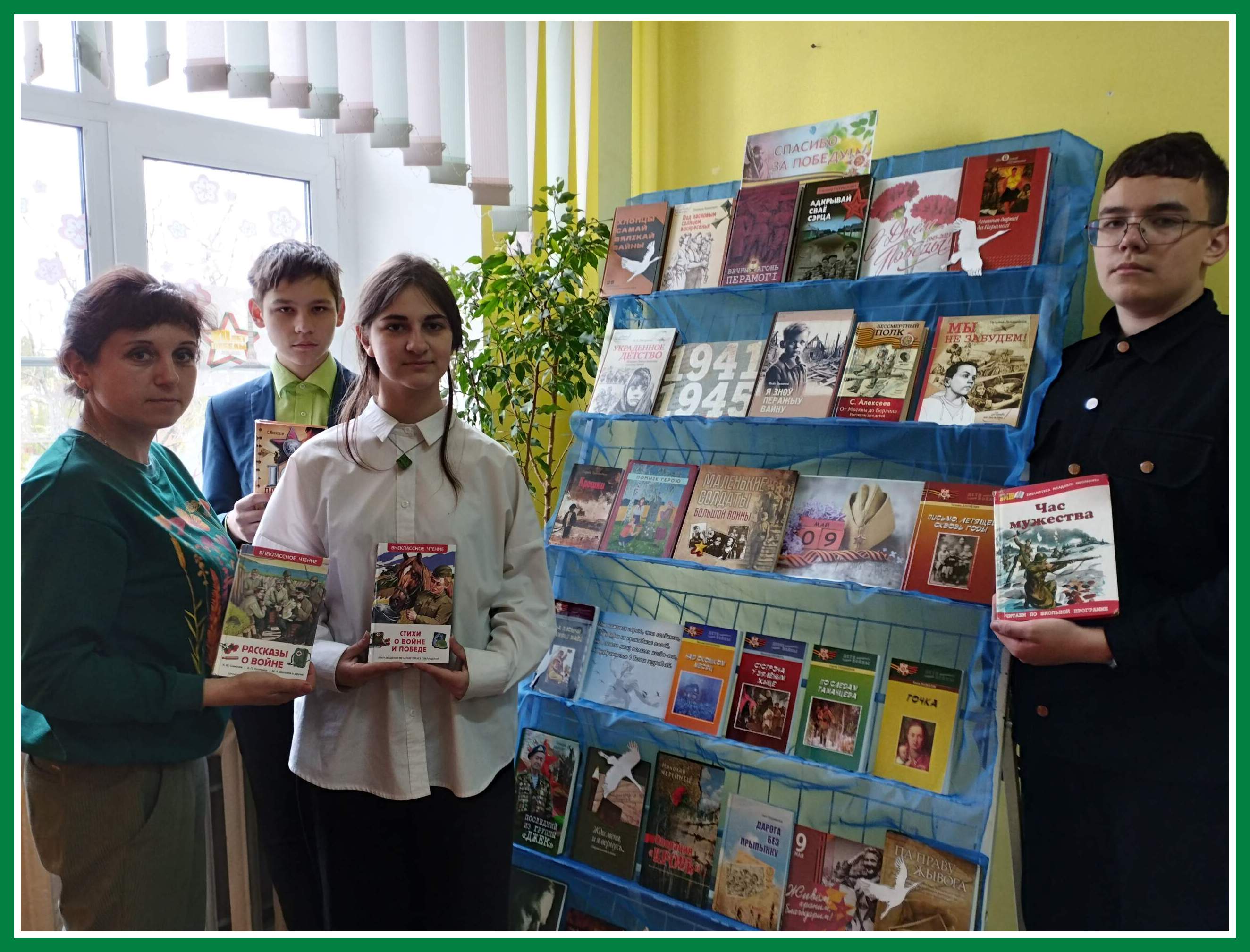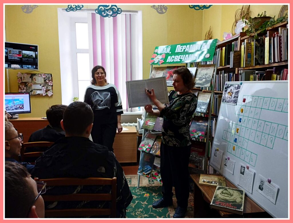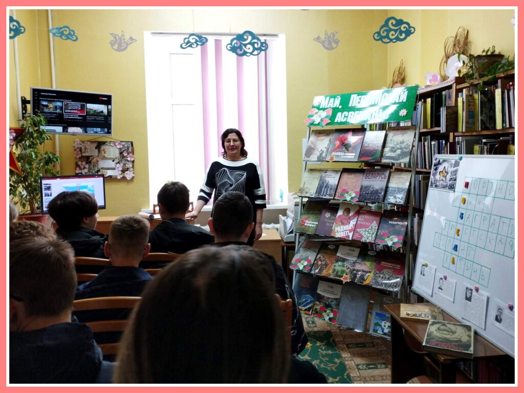 Для наведвальнікаў бібліятэкі дэманстраваліся кнігаметры памяці «Вясна на старонках Перамогі», у якіх расказвалася чаму вайна атрымала назву Айчыннай, як сыходзілі на фронт бацькі, браты, сыны, як у смяротнай сутычцы з ворагам загартавалася і мацнела ў салдат любоў да роднай зямлі, рашучасць абараняць Радзіму.