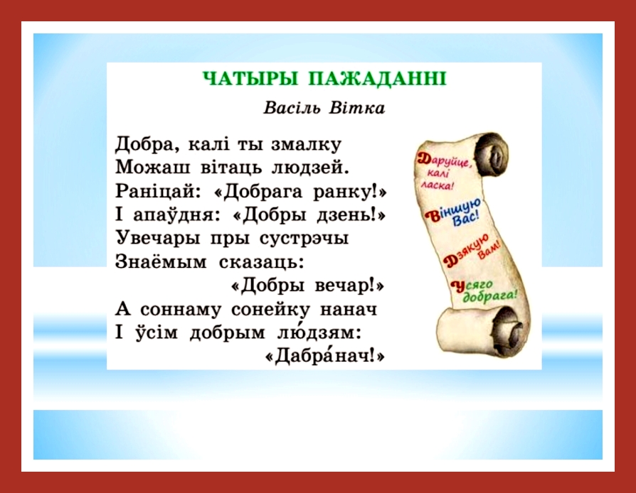 Сённяшняя наша сустрэча яшчэ раз падцвердзіла, што кожны чалавек павінен  шанаваць сваю мову, традыцыі і культуру свайго народа. Нашы маленькія чытачы — вялікія малайчынкі! Мы пажадалі ім часцей прыходзіць да нас ў бібліятэку за самымі цікавымі кніжкамі. У падарунак дзеці атрымалі кніжныя закладкі .