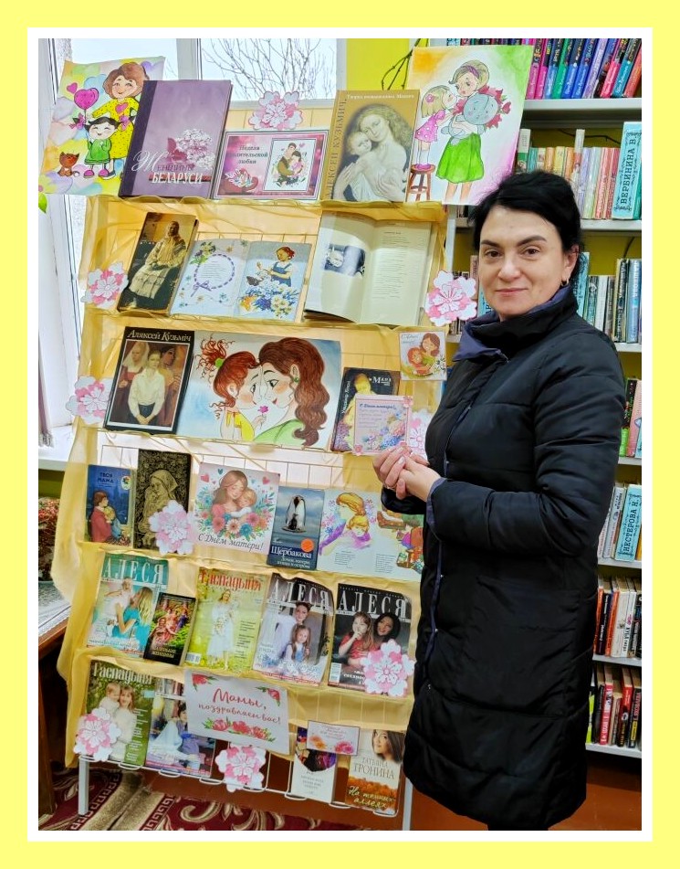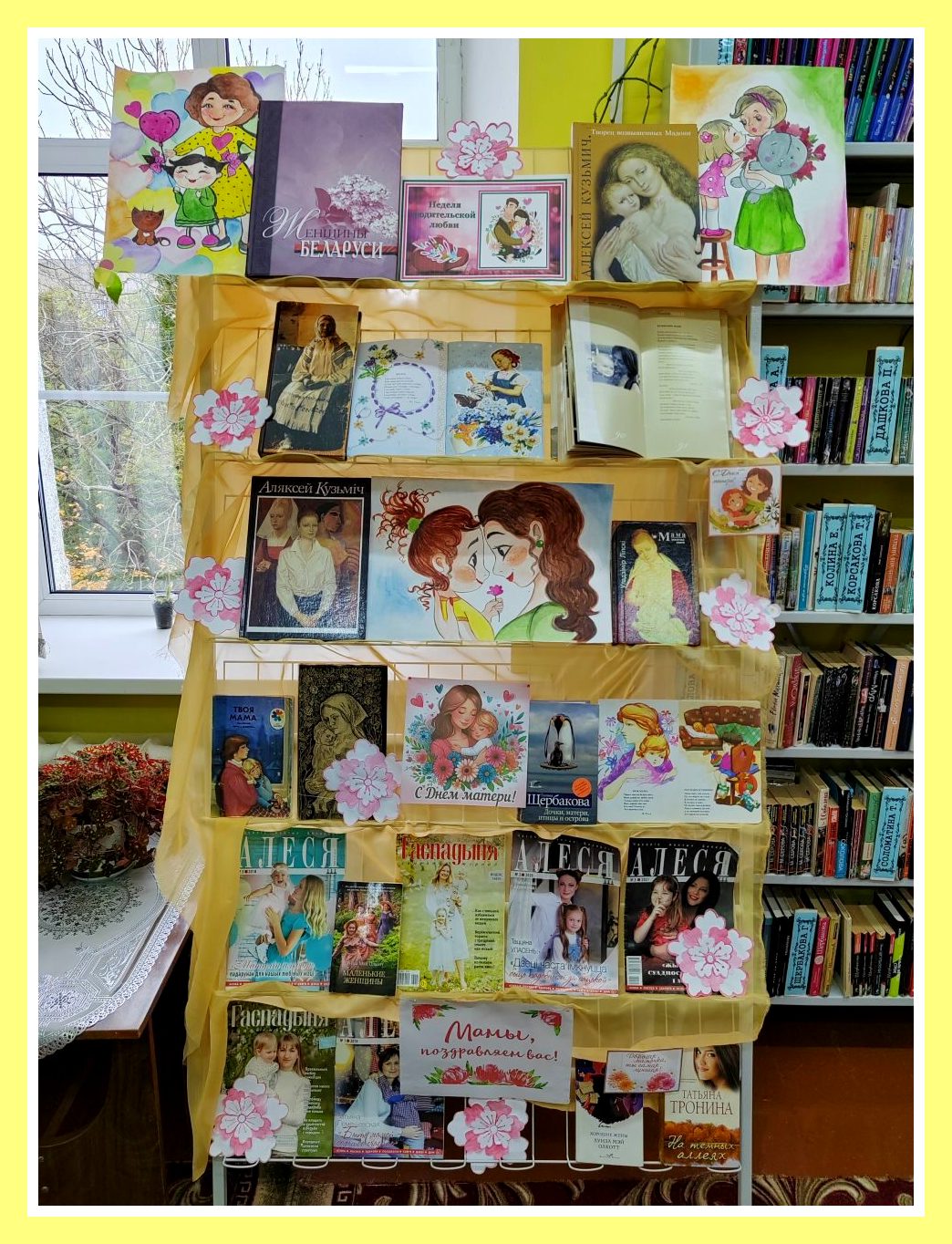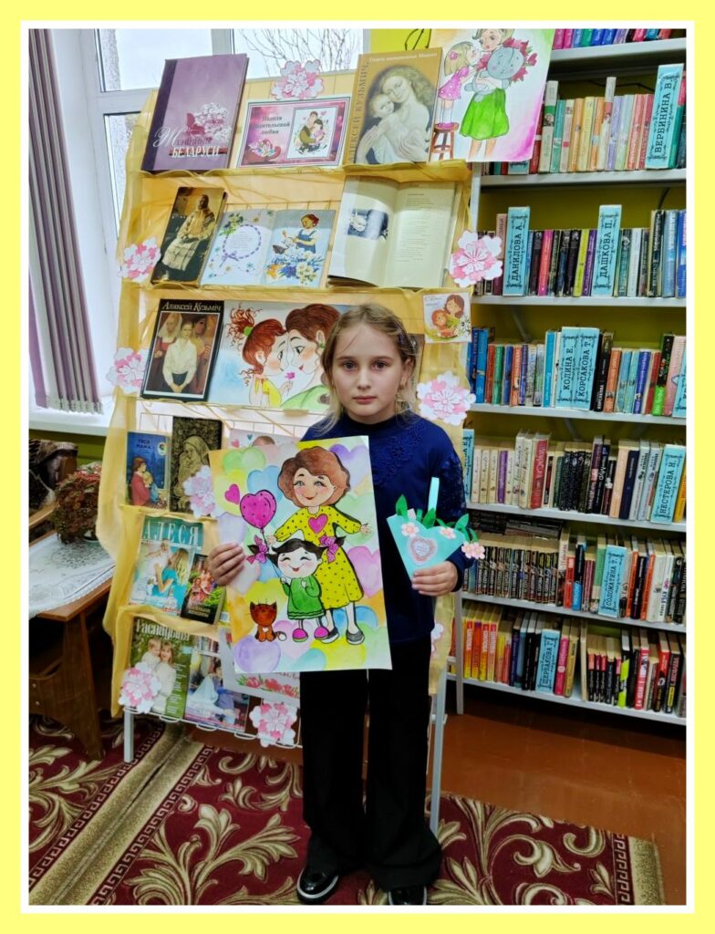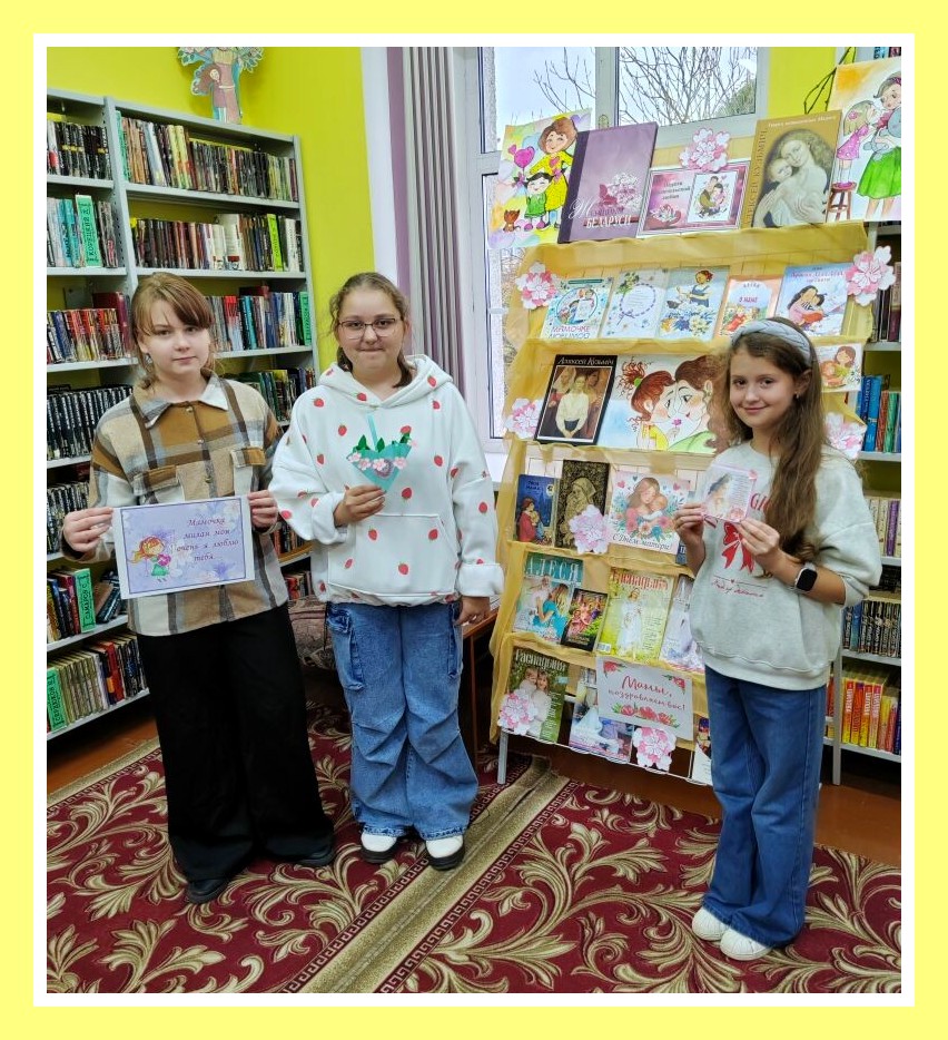 К мероприятию была оформлена выставка-инсталляция «С любовью о маме», на которой представлены не только книги о маме, но и добрые пожелания в адрес женщины – матери, а также детские рисунки «Галерея милых мам».